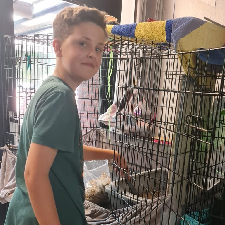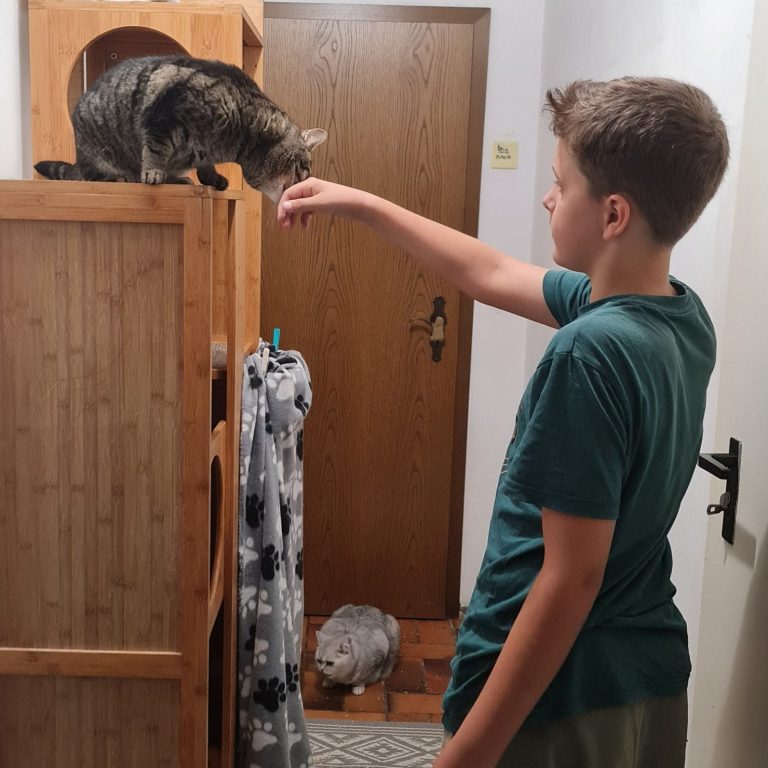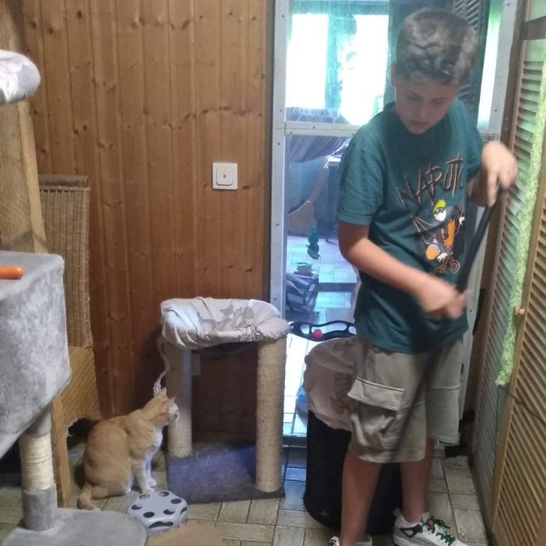 Meine Aufgabe war die Reinigung der Kratzbäume, Decken und Kissen mit einer besonderen Bürste. Außerdem habe ich die Böden in allen Räumen gefegt und die Katzen versorgt und mit ihnen gespielt.