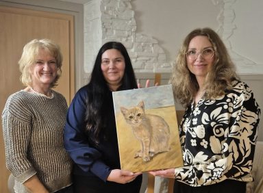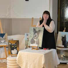Dann kam nach Wochen die Einladung an uns zur Teilnahme an der Vorstellung und anschließenden Versteigerung "unserer Tiere". Wir berichteten davon in unserer Whatsapp-Gruppe, am Ende fuhren dann Karin, Axi und ich nach Hagen und hatten alle großen Spaß an der gemütlichen und lustigen Veranstaltung. Sie fand in einem Hebammenstudio statt und alle Bilder waren vorbildlich wie in einer Galerie auf Staffeleien zur Schau gestellt. Es gab Getränke, Sekt und Süßigkeiten und allerlei selbstgemachtes Fingerfood. Die meisten der ukrainischen Damen, die unsere Bilder gemalt hatten, waren anwesend und nachdem anfängliche Sprachbarrieren überwunden waren, fanden wir durch unsere Tiergeschichten, die wir allen bei der Versteigerung der einzelnen Bilder erzählten, große Anerkennung, zumal die meisten der gemalten Tiere bereits adoptiert worden waren und es somit ein Happyend für sie gab, was die ukrainischen Malerinnen sehr erfreute. Viele von ihnen haben selbst Katzen und es entstanden lebhafte Gespräche, teils deutsch, teils englisch, denn ukrainisch können wir leider alle nicht. Es wurde viel gelacht,auch Olga ´s Schwester war anwesend, "unsere Olga" war leider durch eine Erklältung verhindert, aber schnell stellte sich heraus, dass die ukrainischen Damen sich irgendwie alle untereinander kennen und zusammen halten.